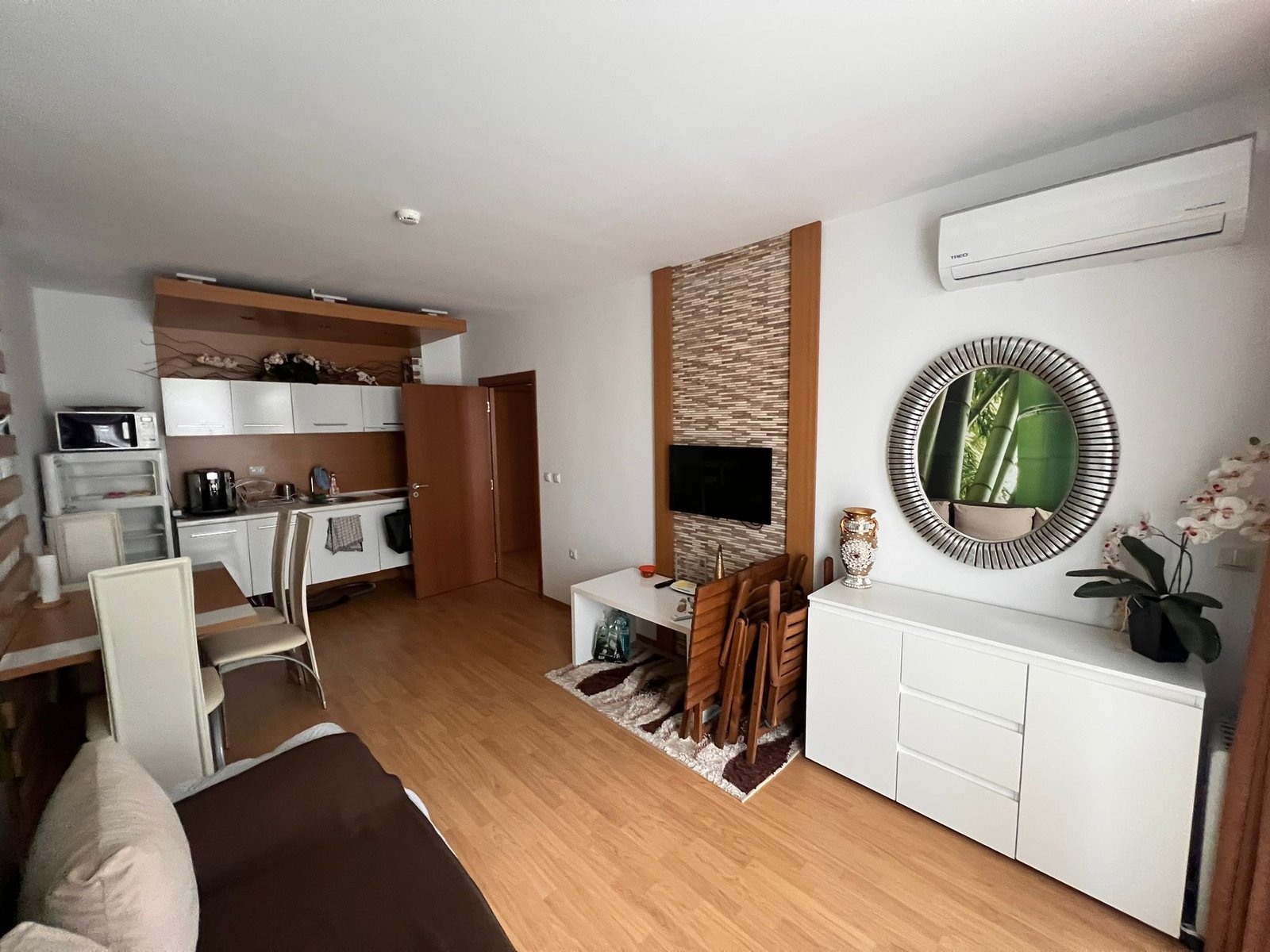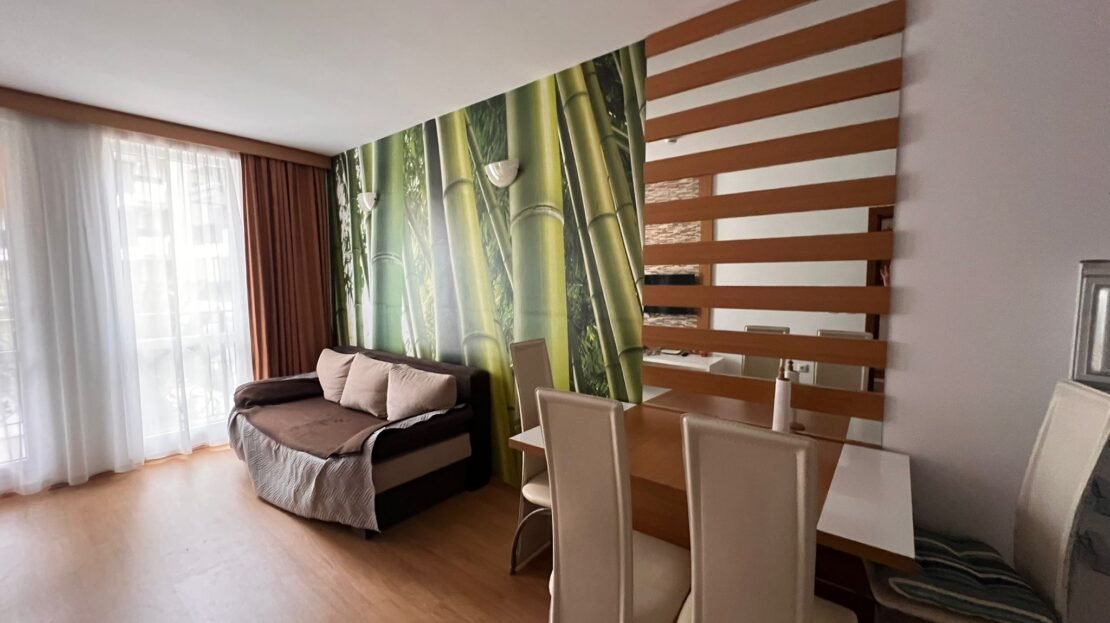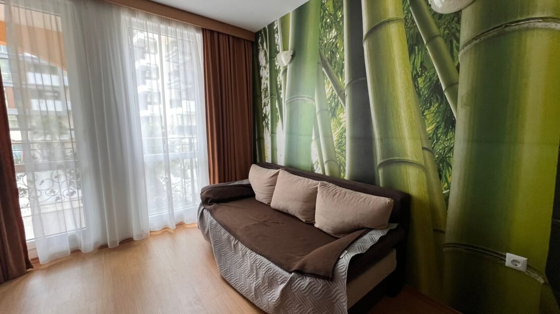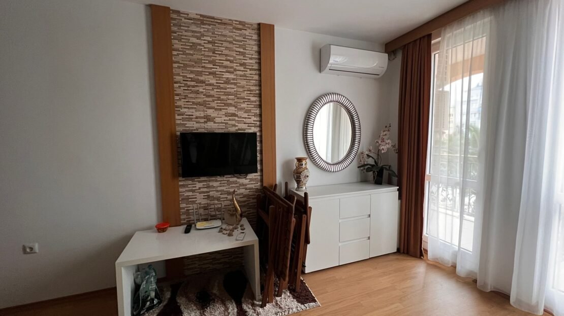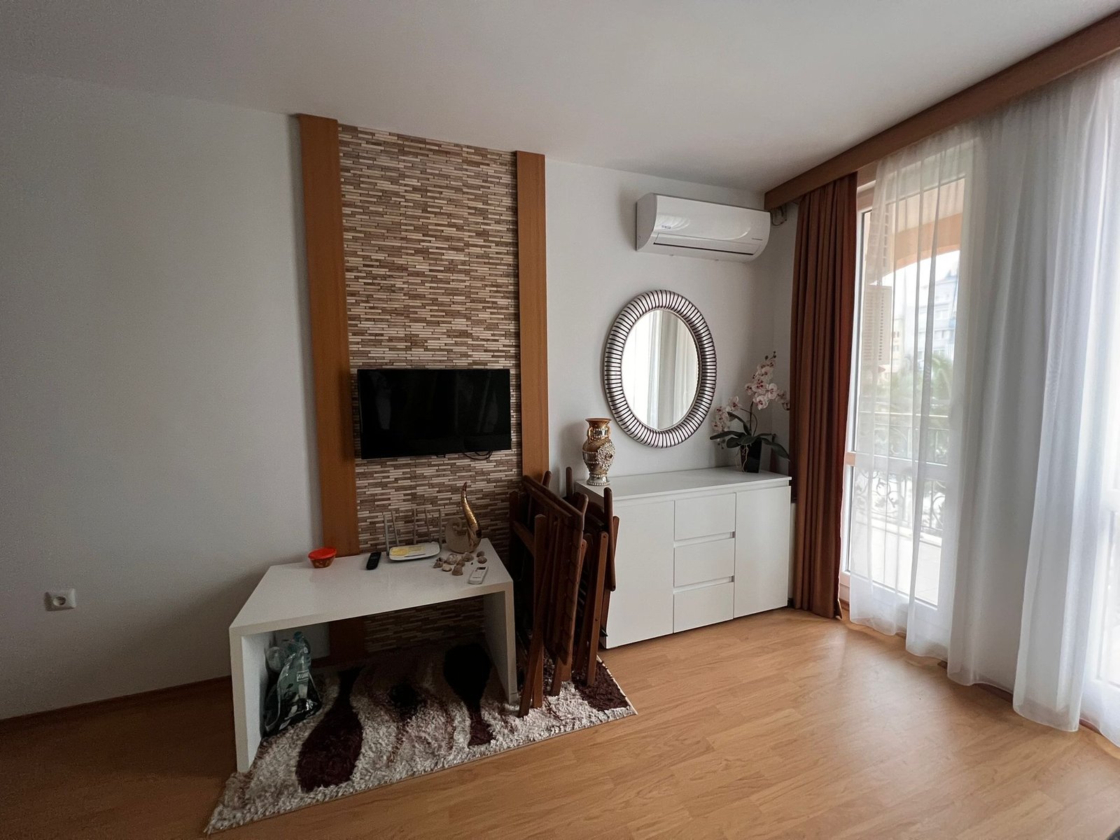 We offer for sale a 1-bedroom apartment in the Suite Hom-1 complex. It consists of a living room with a kitchen area, a bedroom, a bathroom, a large terrace. Sold with furniture and appliances. Ideal for both renting and year-round living. The gated complex Svit Homs 1 is located in the very center of Sunny Beach in a cozy area. Nearby there are restaurants, shops, banks open all year round, which is convenient for permanent residence. In the center of the territory of Svit Homs 1 there is a large swimming pool with a children’s section, a playground, green alleys for walking, a SPA center with a Jacuzzi and sauna, a gym, Parking. The building was put into operation – act 16.